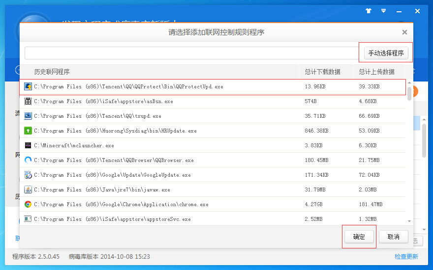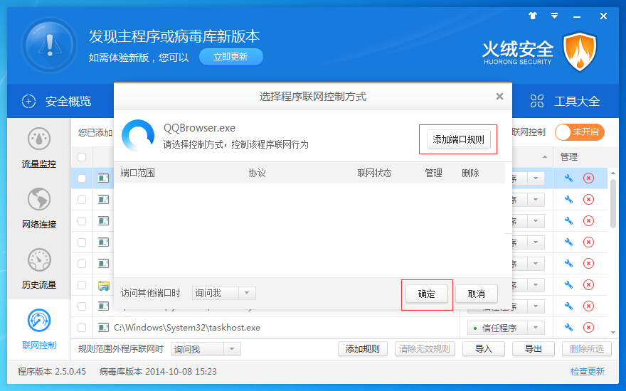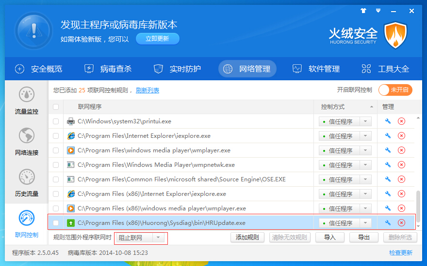 目前建立联网规则有两种方式,手动在联网控制界面选择程序加入规则或者在日常使用时出现联网控制弹窗时勾选记住操作快速加入规则。