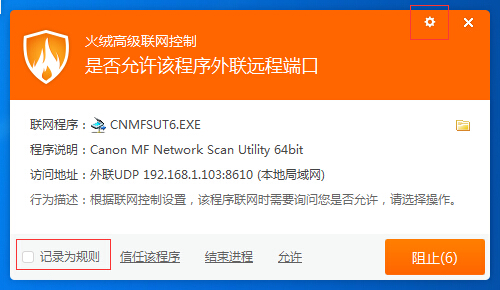 拒绝:阻止该程序连接当前弹窗提示的端口,勾选记录为规则后选择将自动加入联网规则。