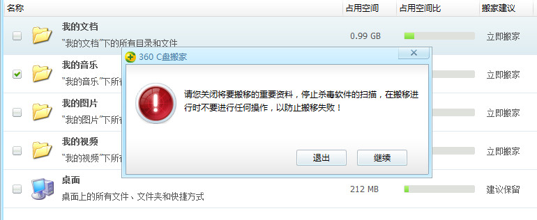 第五步:在弹出的窗口中,确保将要进行搬家的程序已退出的情况下,点击“继续”按钮。