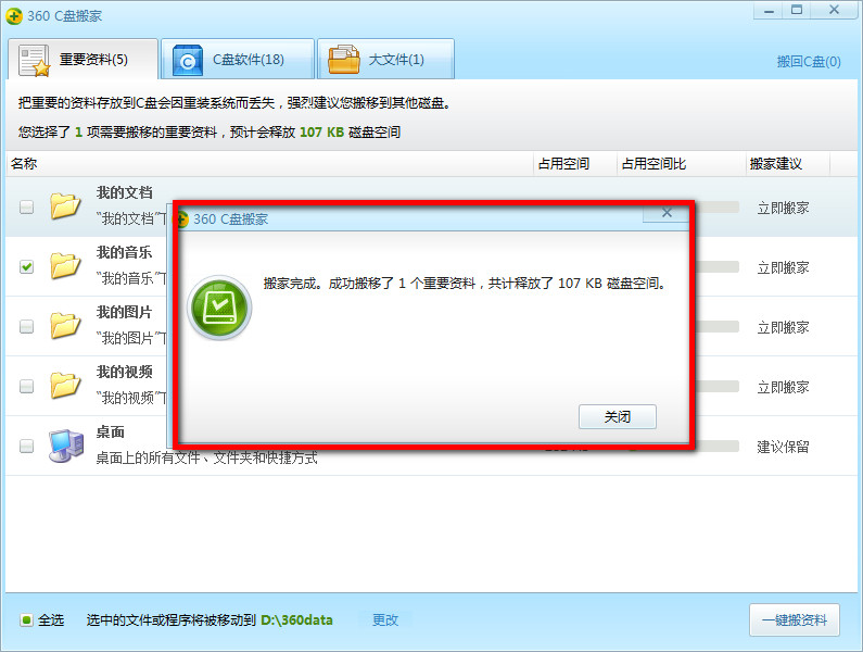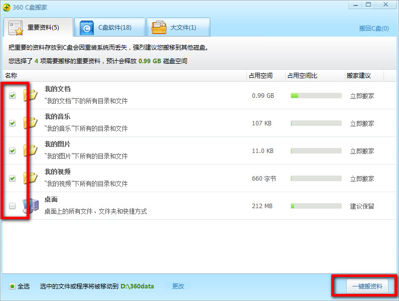 第三步:接着程序会对整个磁盘进行扫描,以确定可以进行搬家的内容。在“重要资料”项中,勾选“我的文档”。