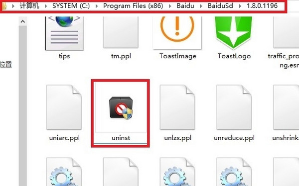 2、进入百度杀毒默认安装路径:C:\Program Files (x86)\Baidu\BaiduSd,双击uninst卸载程序,进行常规卸载
