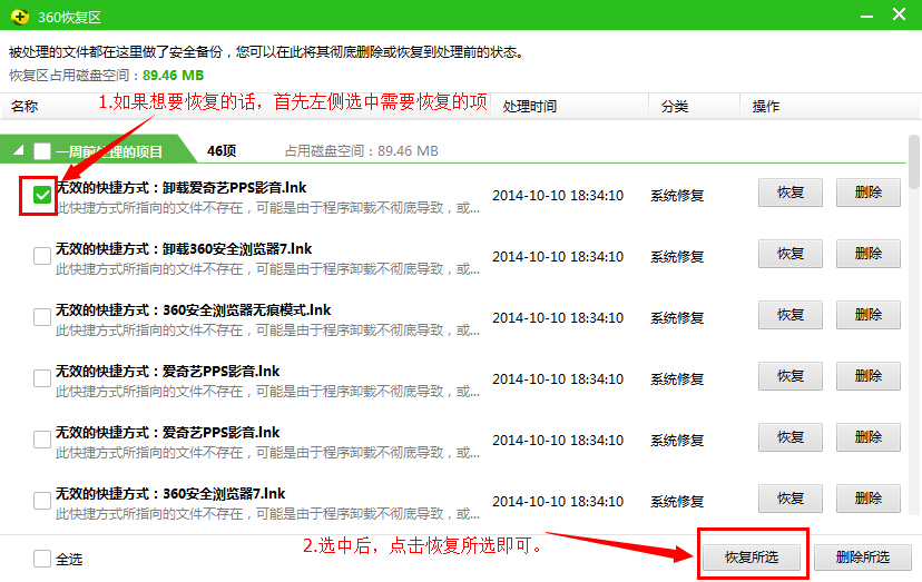 3.在隔离内容中找到您需要恢复的文件,然后在左边将其勾选中,最后点击右下角的“恢复所选”,被隔离的文件将恢复到原来保存的路径中