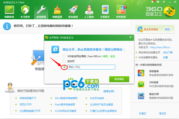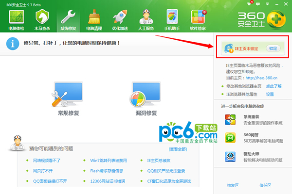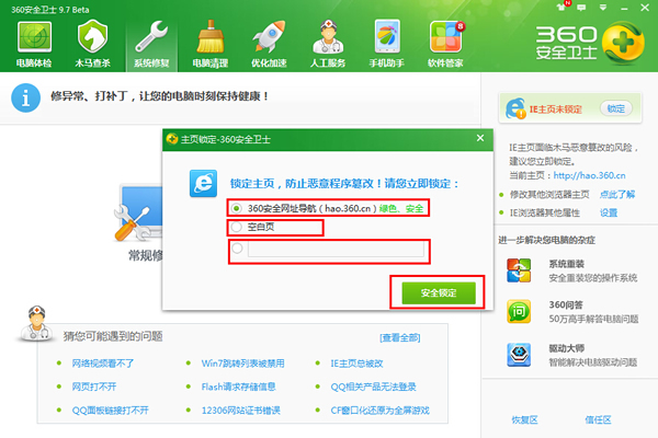 通常我们在安装某些软件时如果电脑上装了360安全卫士的话会经常跳出一个说某某软件正在修改ie主页的窗口提示,我们只要锁定ie主页不让任何软件来修改就能确保电脑不被病毒所侵。下面就来告诉大家360安全卫士怎么锁定主页。