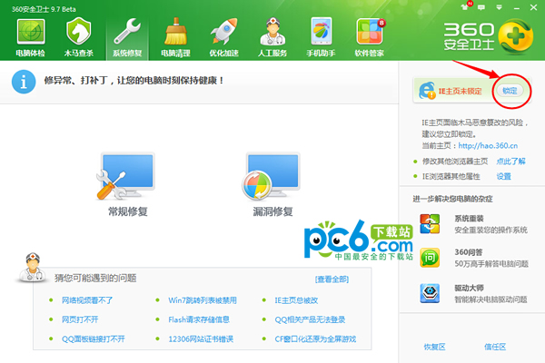 在点击“系统修复”这个标签后,如下图箭头所指之处,你如何没有锁定你的IE主页,那么这里你就看到“IE主页未锁定”这个字样。