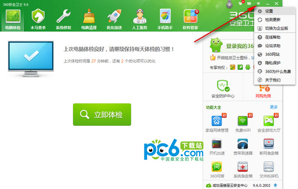 首先打开360安全卫士,然后找到主菜单也就是倒三角形符号,点设置
