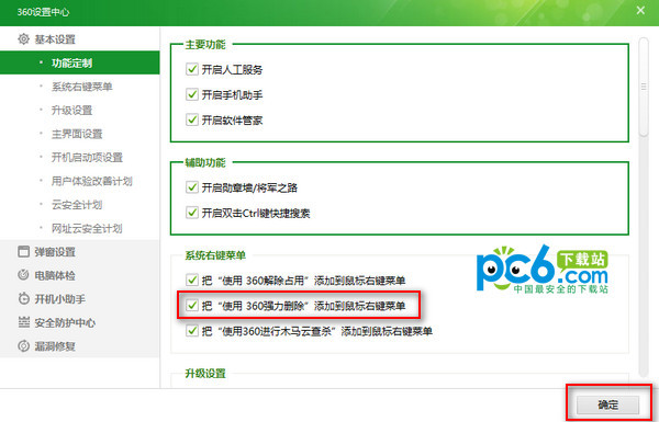 在360设置中心,基本设置中找到系统右键菜单,然后将把“使用360强力删除”添加到鼠标右键菜单前面的勾勾上,最后确定即可。