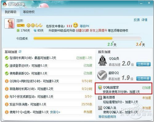 因此,对渴望加速QQ等级升级的网友来说,QQ电脑管家确实是个不错的选择。每天开启防护的QQ电脑管家30分钟至全天,则当天QQ等级加速额外增加1天。