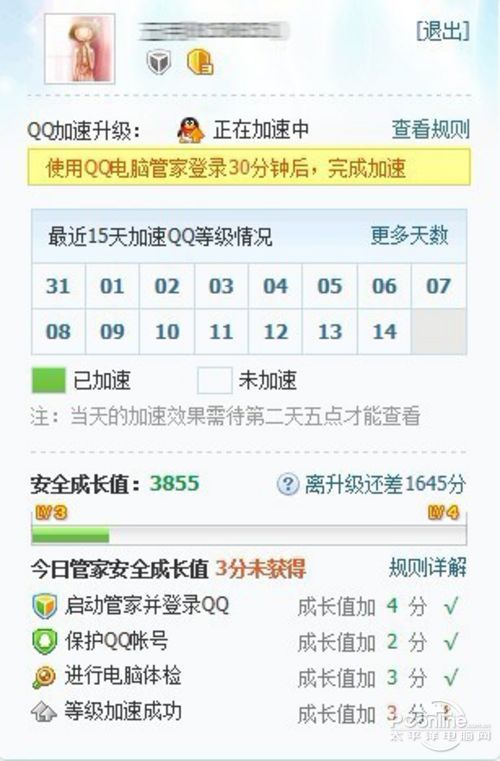 此外,用户还可以登录QQ电脑管家官网,查看自己的QQ加速升级情况和安全成长值。