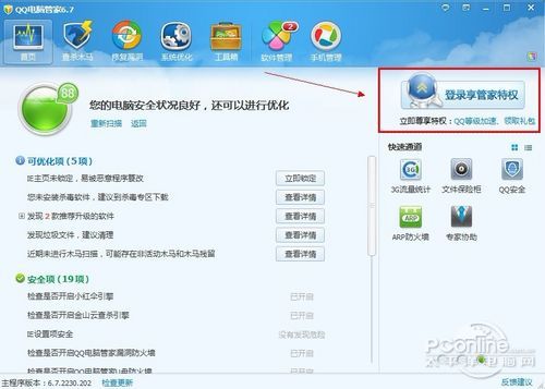 首先,先下载安装新版本的QQ电脑管家。安装完毕后,在QQ电脑管家的首页右上方可以看到登录享管家特权。