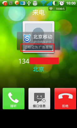 被标记过的号码,再来电话之后,效果就很明显了。这个功能不仅只对自己的功能,只要手机上安装了安全管家的,同一个号码来电的时候也会同样的显示!