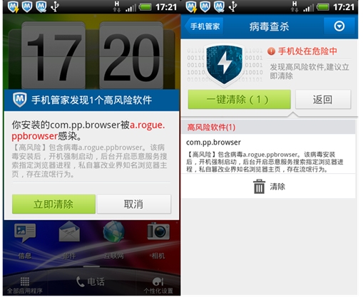 据悉,遭遇假面浏览病毒替换了软件界面后,很可能导致用户手机上网账号、银行帐号被泄漏等隐私安全问题。目前,腾讯手机管家已经首家支持对该病毒的精准查杀,用户可以从官方网站载安装,并开启全盘扫描。