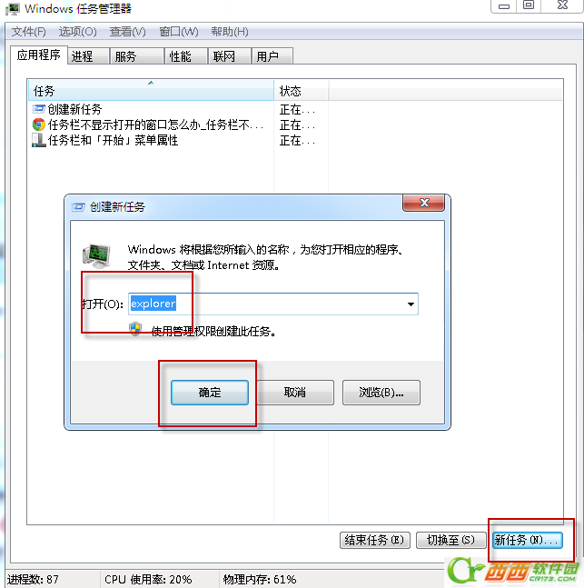然后点击,新建任务,在任务新建打开选项输入 explorer 确定即可,您在查看任务栏您会发现,之前打开的窗口又正常恢复了