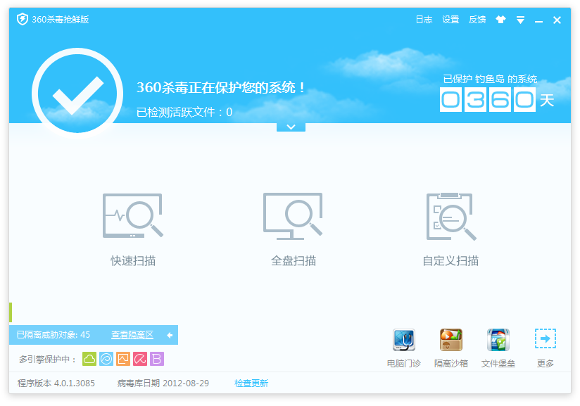 360杀毒4.0“云动”以至轻至强的智能防御,至简灵动的用户界面,让您提前感受下一代杀毒软件带来的全新体验。