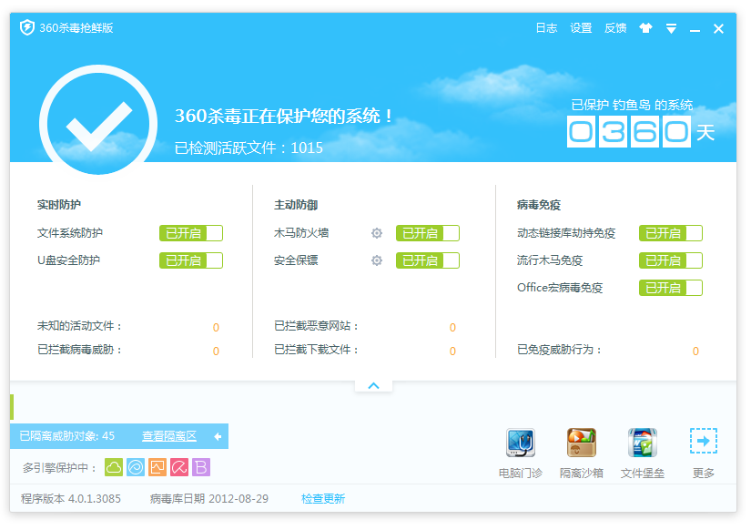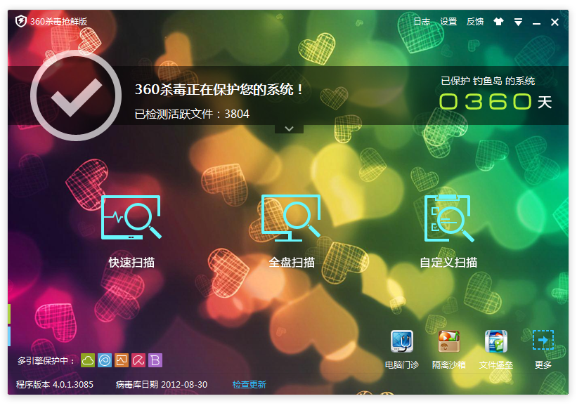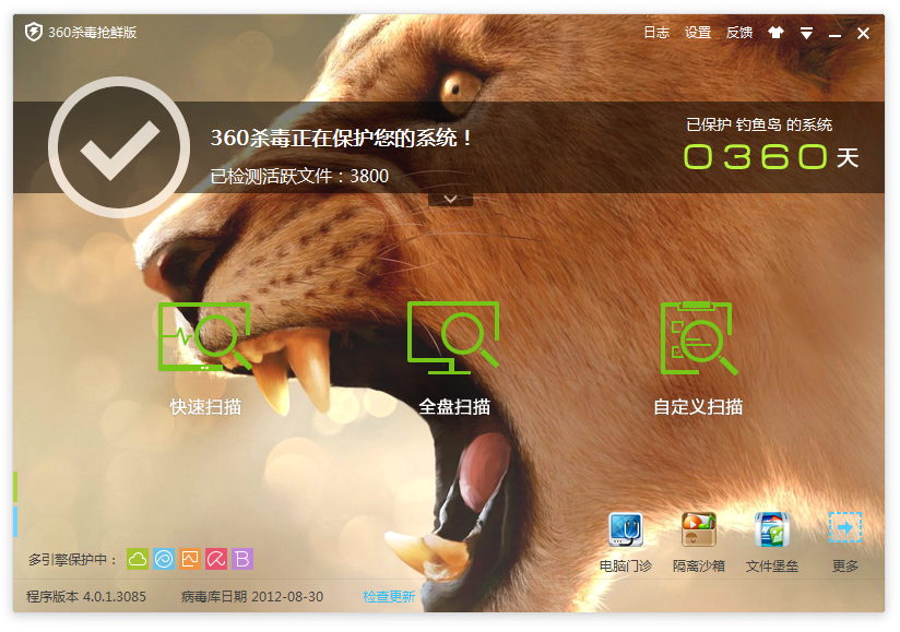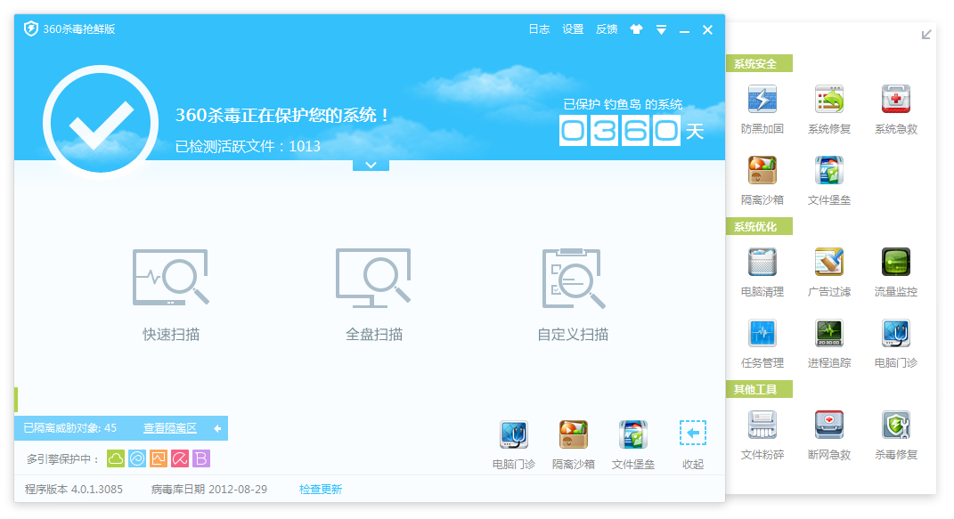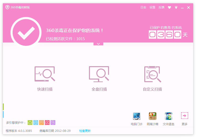 360杀毒3.0在不久前通过了全面严格的安全测试,成为首家进入Windows 8 应用商店的国产杀毒软件。360杀毒4.0不但全面继承了360杀毒3.0的优良品质,更是带来了创新的技术和功能特性 - 全新构建的监控防御架构,在不牺牲系统性能的前提下全面提升了对病毒拦截的灵敏度;内嵌360人工智能启发式引擎QVM第二代,杀毒更聪明;加强版沙箱,杜绝病毒感染与隐私泄露;小红伞与BitDefender引擎可同时开启,提供更加凌厉的查杀和监控能力;耳目一新的“云动”交互界面,让您在尽享安全之余,更能有便捷、愉悦的使用体验。