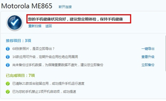 图4 腾讯手机管家PC版显示手机健康状况良好