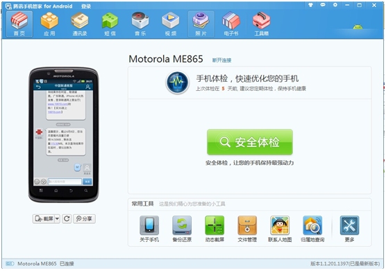 图1 腾讯手机管家PC版上大大的的“安全体检”绿色按钮