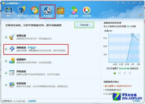 在QQ电脑管家的“系统优化”中有“清除痕迹”的入口,点击“查看详情”即打开“清除痕迹”功能窗口。