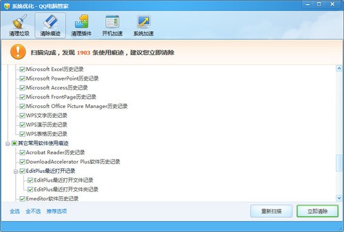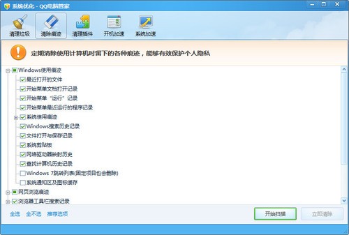 QQ电脑管家可以删除的使用痕迹比较全面和细致,但并是将所有痕迹都清除就是最好的方式。因为有些“痕迹”可以记录我们的使用习惯,一旦清除,再用到时就要重新设置,反而给使用带来了不便。所以建议大家在选择要清除的使用痕迹时,尽量不要“全选”,而是点击“推荐选项”,QQ电脑管家会帮你保留那些有益无害的痕迹。