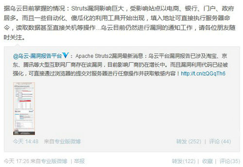 另国内知名安全漏洞平台乌云网站显示,从昨日开始,收到国内大量知名站点因使用Struts应用框架产生的漏洞,涉及网站包括库巴网、百度、中国联通分站、易宝支付、土豆网、京东商城、1号店、百合网、网易、搜狐、淘宝等。目前影响网站仍在增长中。而且漏洞利用代码已经被强化,可直接通过浏览器的提交对服务器进行任意操作并获取敏感内容。