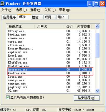 (1)占用内存。金山毒霸2012据说最大的亮点是快,运行毒霸2012后,笔者迫不及待的想了解下内存占用的情况,结果发现进程管理器里仅显示2个进程,占用内存仅有10M左右,可以说与同类杀毒软件相比,已经相当小。