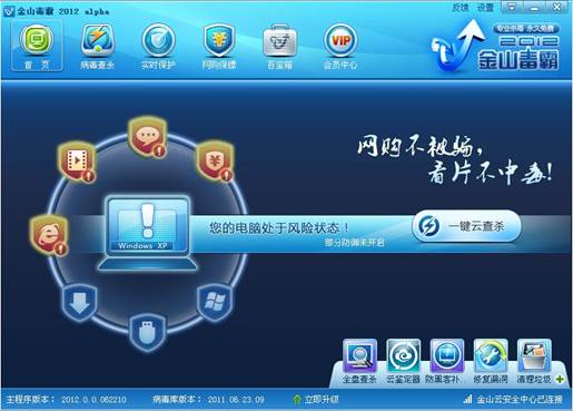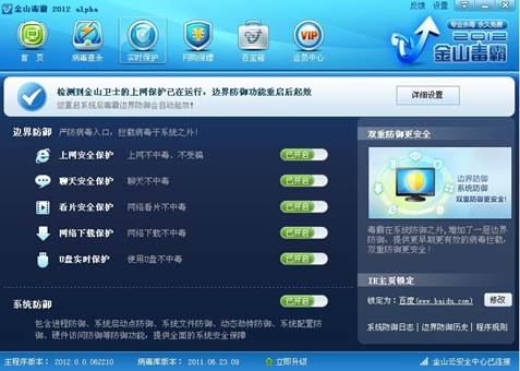 金山毒霸2012在技术方面还是有一些新的东西,比如重点强化了杀毒软件的防护功能,推出了边界防御,这个在产品界面上也所有体现。