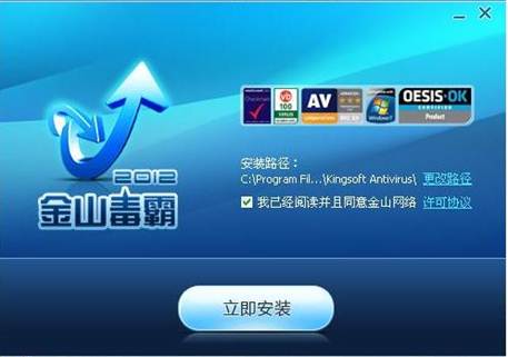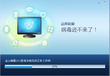 如果说小巧的安装包让人感到很欣喜,那么大约7秒钟的安装速度真的有点让人瞠目结舌。之前安装杀毒软件,下一步,下一步的选择至少也需要个2-3分钟吧,金山毒霸2012一眨眼个功夫就安装完毕,确实被惊到了。
