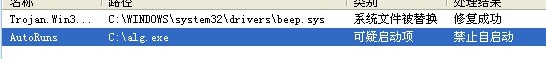 1、杀毒软件反复对beep.sys和c盘根目录下alg.exe报毒却无法清除;