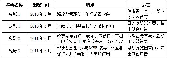 “鬼影”病毒家族主要包括三代“鬼影”病毒和“魅影”分支,共同特征是感染电脑硬盘的主引导记录(MBR)。当受害电脑开机时,“鬼影”病毒家族会比Windows系统更早加载到内存中运行,从而使病毒获得系统控制权。