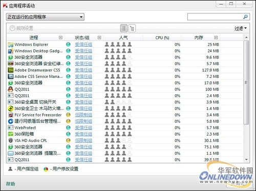 众所周知一般的木马病毒程序的运行往往都是悄无声息的,很多甚至在进程里都找不到。卡巴斯基安全部队2012则可以帮助用户检测到所有正在运行的应用程序,一旦发现可疑的应用程序或者陌生的应用程序,用户可自主的将其移至低限制组、高限制组乃至不信任组。