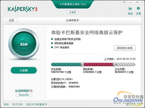在卡巴斯基云保护中心用户能够实时的看到卡巴斯基云保护处于一个什么样的状态。当然这都是次要的,最主要的是卡巴斯基在KSN(卡巴斯基安全网络)参与者计算机上发现可疑或不可识别的数据时,会自动将其发送给卡巴斯基的安全团队。卡巴斯基实验室能够实时的分析那些潜在的威胁,并将保护更新实时发送给所有的用户,其余所有的用户就不用担心遭受该可疑程序的侵袭了。