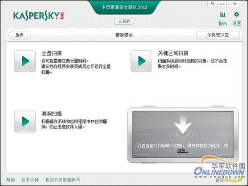 卡巴斯基2012的智能查杀分为全盘扫描、关键区域扫描以及漏洞扫描三个模块,用户可以根据自己的实际情况选择相应的模块,除此之外用户还可以自定义扫描单个对象。