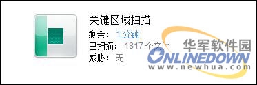 比如我们希望对电脑系统的关键区域扫描一下,就只需要点击下“关键区域扫描”按钮,软件就会自动开始扫描,且在图标上直观的显示扫描进度,在图标的右边显示剩余时间,已扫描的文件数以及是否存在威胁等。