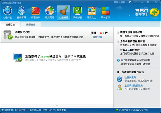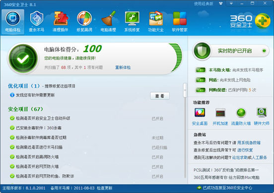 体检可以让您快速全面的了解您的电脑,并且可以提醒您对电脑做一些必要的维护。如:木马查杀,垃圾清理,漏洞修复等。定期体检可以有效的保持您电脑的健康。