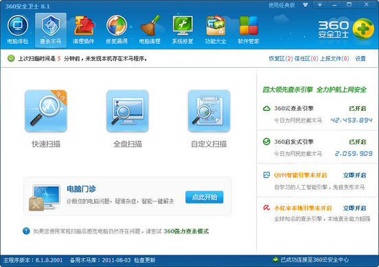 360安全卫士5大王牌功能:木马查杀、清理插件、修复漏洞。。