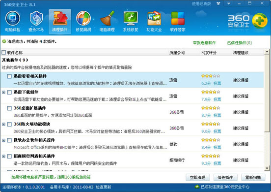 插件是一种遵循一定规范的应用程序接口编写出来的程序。很多软件都有插件,例如在IE中,安装相关的插件后,WEB浏览器能够直接调用插件程序,用于处理特定类型的文件。过多的插件会拖慢你的电脑的速度。清理插件功能会检查你电脑中安装了哪些插件,您可以根据网友对插件的评分以及你自己的需要来选择清理哪些插件,保留哪些插件。