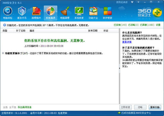 可单击右下方的“重新扫描”以查看是否有需要修补的漏洞。