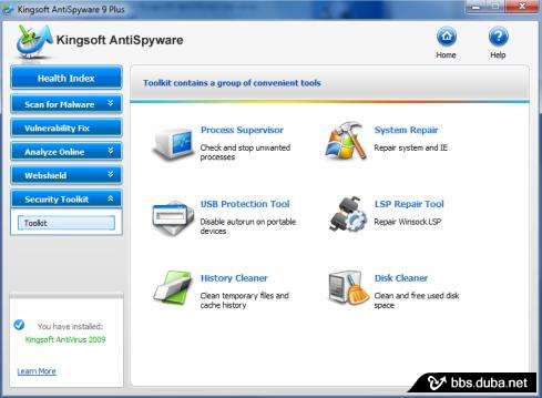 这里值得特别重视的是:金山毒霸互联网安全套装没有一个全功能界面,实际上是三个不同的界面和独立的程序。这三个程序分别是反病毒、反间谍和专业防火墙。
