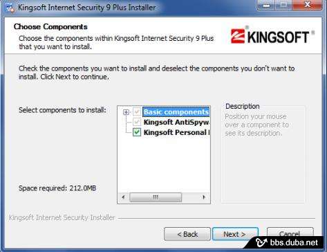 安装金山毒霸互联网安全套装包括两个步骤。第一个步骤,叫做“安装”,让用户来选择安装路径和决定是否安装防火墙:
