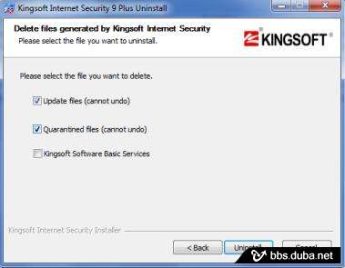 不幸的是,即使是卸载程序也非常混乱。在windows 7控制面板里,有三个金山软件的项目和程序:金山软件基础服务、金山互联网安全套装9,和金山漏洞修复。卸载金山毒霸互联网安全套装9包括以下对话窗口: