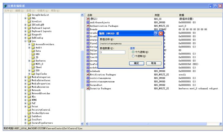 运行“regedit”命令,打开HKEY_LOCAL_MACHINE\SYSTEM\CurrentControlSet\Control\Lsa,把restrictanonymoussam的值改为1,如下图所示。