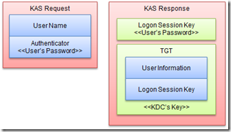 KAS成功认证对方的身份之后,会先生成一个用于确保该用户和KDC之间通信安全的会话秘钥——Logon Session Key,并采用该用户密码派生的秘钥进行加密。KAS接着为该用户创建“认购权证”——TGT。TGT主要包含两方面的内容:用户相关信息和Logon Session Key,而整个TGT则通过KDC自己的密钥进行加密。最终,被不同密钥加密的Logon Session Key和TGT返回给客户端。(以上的内容对应流程图中的步骤1、2)