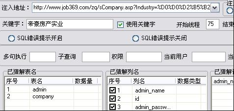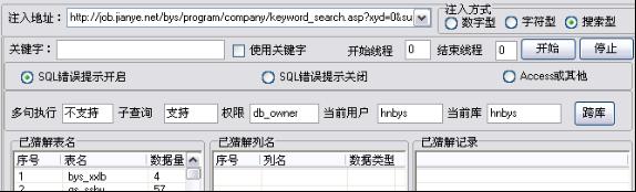 http://www.xxx.com/query.asp?Industry=%D0%D0%D2%B5%B2%BB%CF%DE&DateTime=%CA%B1%BC%E4%B2%BB%CF%DE&Province=%B5%D8%C7%F8%B2%BB%CF%DE&City=%B5%D8%C7%F8%B2%BB%CF%DE&EduLevel=%D1%A7%C0%FA%B2%BB%CF%DE&Sex=%D0%D4%B1%F0%B2%BB%CF%DE&CompKey=&x=0&y=0&PosiKey=计算机。这里还有一个问题,就是URL过长的话,有可能被截断,此时用工具就检测不出来漏洞了。由于URL过长,我使用NB的时候就失败了,后来发现用HDSI可以输入较长的URL。很快注入结果就被跑出来了,如图2所示。