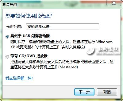 插入一张空白的CD-R刻录盘后,Windows 7的资源管理器中马上显示出了光盘的可用容量。不像其他系统那样会弹出自动播放的窗口,Windows 7处于安全性的考虑需要手动打开刻录光盘来进行相关操作。打开刻录光盘后会弹出“刻录光盘”的提示窗口,可以选择两种刻录的类型,我们选择“类似于USB闪存驱动器”就可以像使用闪存那样使用刻录光盘了(如图1)。接着设置一个光盘的标题,而另一种刻录类型仅适合刻录批量的MP3、AVI等多媒体文件(适合多媒体光盘播放器使用,刻录后无法编辑或删除文件)。然后点击“下一步”按钮,将开始光盘格式化,之后就无法进行其他方式的刻录了。