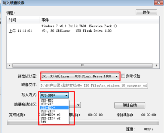 4.选择u盘,写入方式选择“USB-HDD+”,最后点击“写入”。