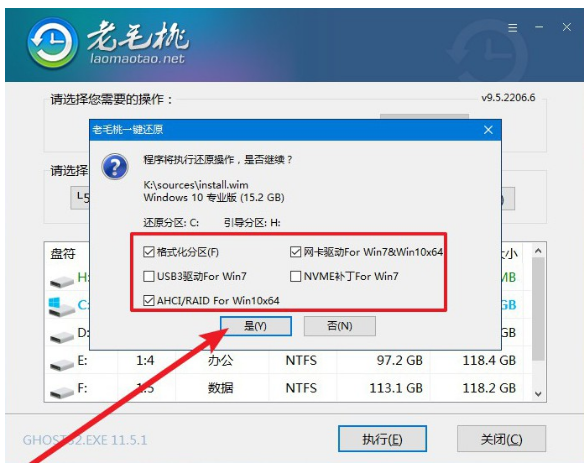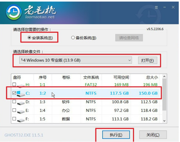 1、 在老毛桃winpe桌面,打开老毛桃一键装机软件,找到win10系统镜像,安装在c盘,点击执行。