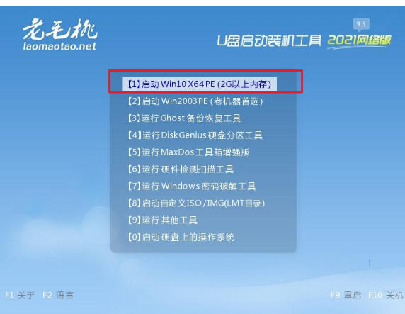 2、进入老毛桃winpe 主菜单后,我们选择【1】Win10X64PE(2G以上内存)并回车。