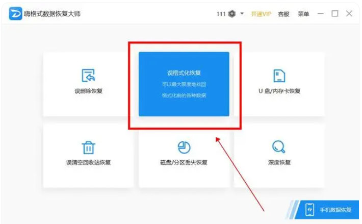 1、运行电脑上安装好的【嗨格式数据恢复大师】软件,软件主页上有六个恢复模式,这里需要点击“误格式化恢复”模式。