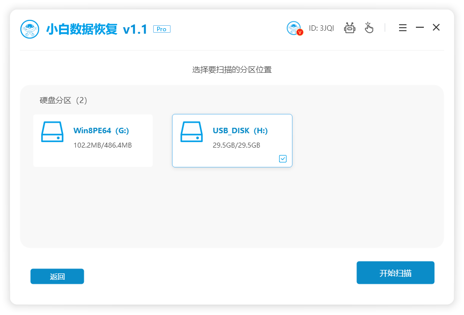 1、下载安装小白数据恢复工具,打开后,选择u盘内存卡恢复选项,点击开始扫描。