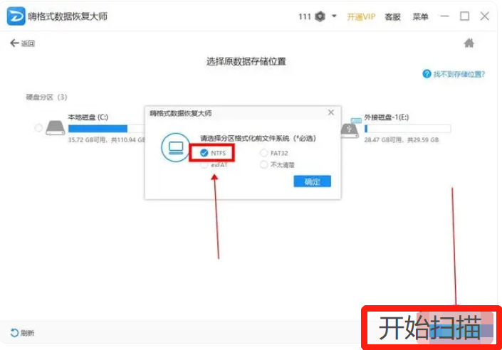 3、在弹出窗口中点击分区格式化前的文件系统并确定,选择好后点击“开始扫描”。