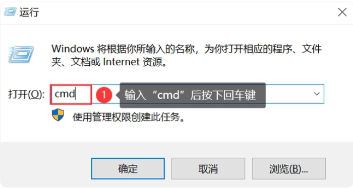 1、按下快捷键【win+R】后输入【cmd】,打开管理员窗口。